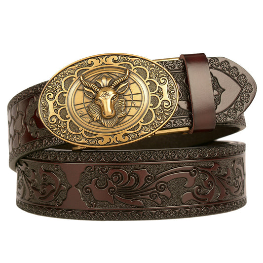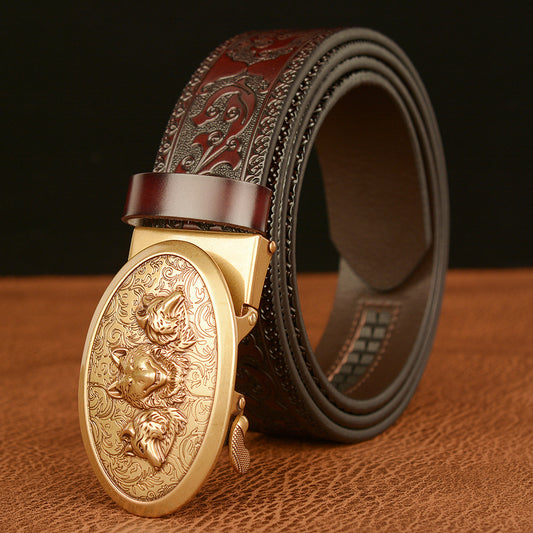 Herren-Ratschengürtel, Echtledergürtel mit automatischer Wolfsschnalle aus Legierung | TCZD003