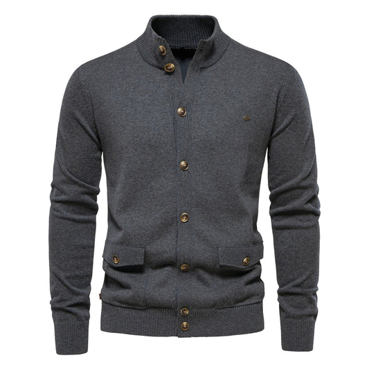 Herren-Strickjacke aus Baumwolle mit Zopfmuster, Taschen, Stehkragen, Button-Down-Pullover | CW61
