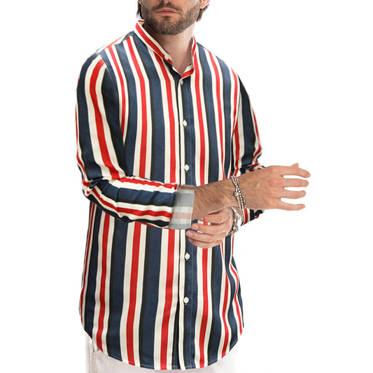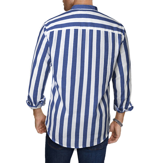 Lässiges Herrenhemd aus Baumwolle mit Streifen und langen Ärmeln und Leinengefühl, Stehkragen, Button-Down-Hemd | +MC255371-4019