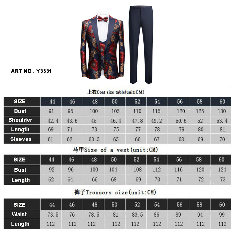3-teiliger Herrenanzug mit Revers, Blumenmuster, einem Knopf, moderne Smoking-Sets | Y3531-1