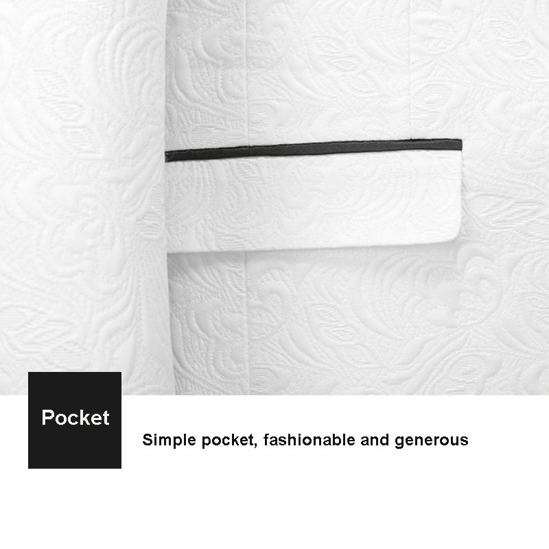 - Merkmale und Designs: Ein Knopfverschluss, lange Ärmel mit 3 Knöpfen an den Manschetten, Jacquard, Schalkragen. Es gibt 3 Außentaschen, darunter 1 Brusttasche und 1 Pattentasche auf jeder Seite; und 1 echte Tasche innen; 2 Taschen an der Hose