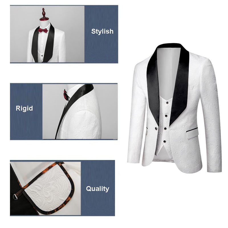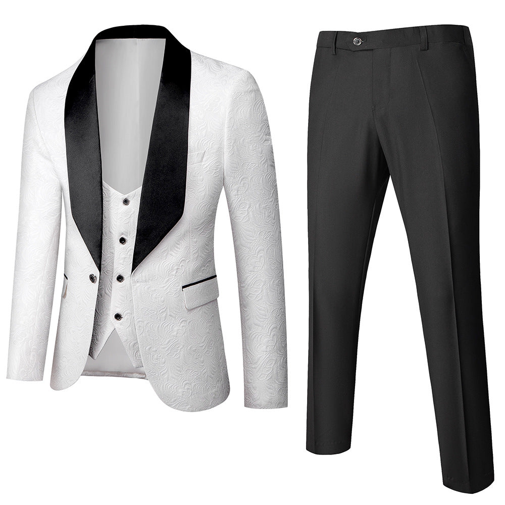 3-teiliger Herrenanzug mit geprägtem Blumenmuster, schmale Passform, Jacquard- Smokingjacke, Einknopf -Paisley-Schalrevers, Anzugsblazer, Jacke, Weste und Hose für Abendessen, Abschlussball, Hochzeit