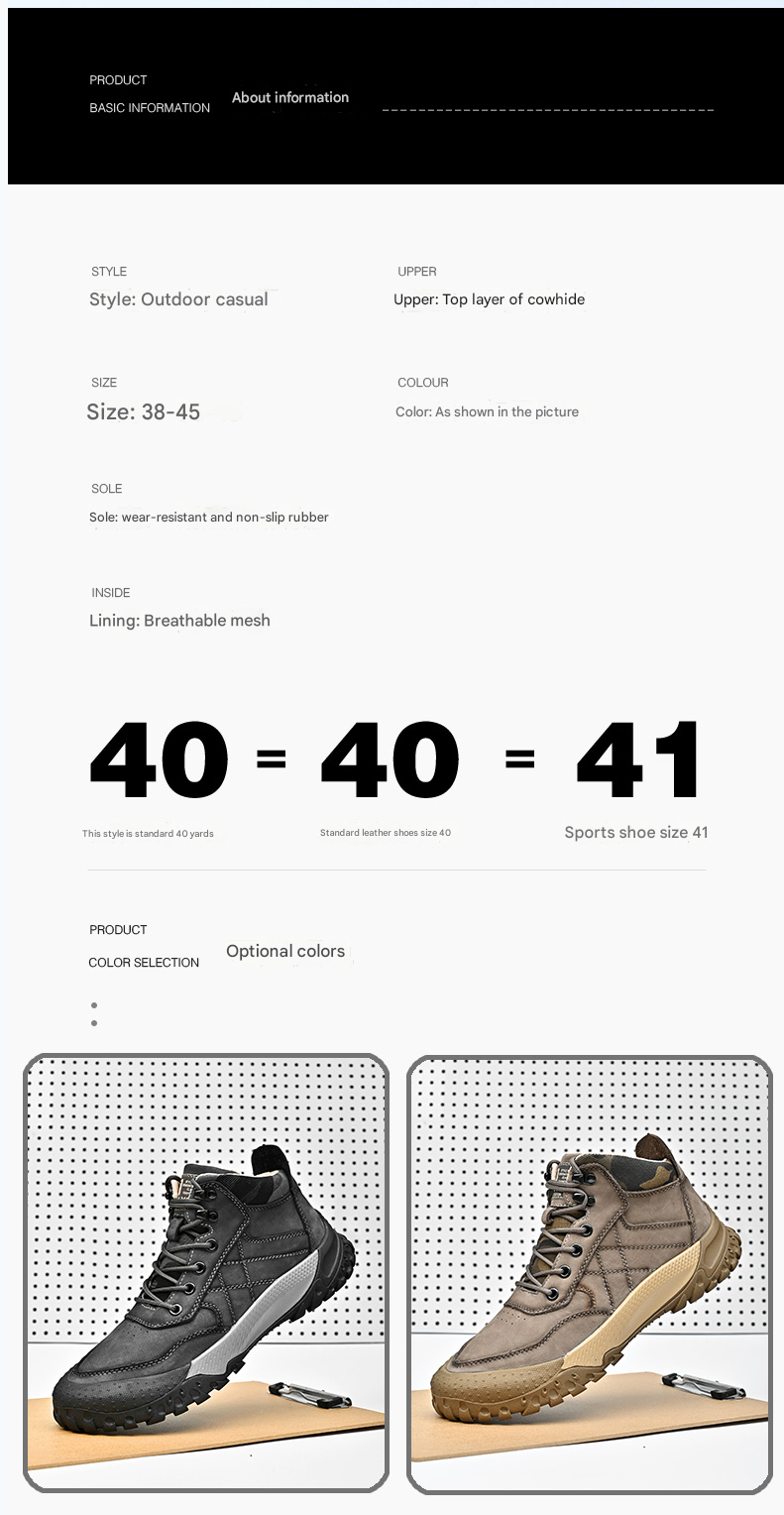 Bringen Sie Ihre Outdoor-Abenteuer mit unseren Herren-Wanderschuhen aus echtem Leder auf das nächste Level. Diese High-Top-Martin-Stiefel aus hochwertigem Leder bieten Langlebigkeit und Komfort für Ihre Füße. Perfekt für jede Outdoor-Aktivität, bieten diese lässigen, trendigen Schuhe Stil und Funktionalität.